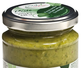 Pesto da 120 g preparato con una selezione accurata degli ingredienti: l'utilizzo esclusivo di Olio extra-vergine d'oliva, formaggio Grana Padano e Pinoli