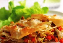 Torta di pasta fillo con funghi, porro e peperoni rossi