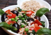 Insalata d’orzo con piselli, erbette e pomodori al basilico