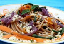 Spaghetti profumati alla menta con cipolle rosse, carote e fagiolini lunghi