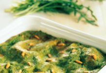 Lasagne di farro con crema di rucola, emmental e pinoli