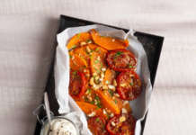 Zucca in teglia con pomodori confit e salsa di yogurt