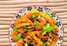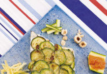 Branzino con gratin di nocciole, zucchine e barchette al peperone