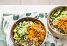 Miglio e lenticchie con pistacchi e tagliatelle di carote e zucchine