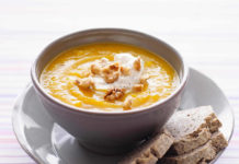 Crema di porri e zucca con pane di grano saraceno e formaggio alle noci