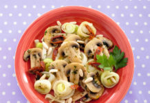 Casseruola di porri e funghi con pomodori secchi e pinoli