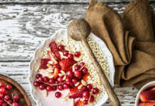 Smoothie bowl rosa alla ricotta con ciliegie, fragole e ribes