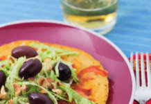 Frittata di ceci ai peperoni con insalata, olive e nocciole