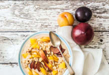 Smoothie bowl vegan di pesche e frutta gialla con nocciole