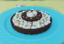 Crostata al cacao con namelaka al cioccolato bianco e pistacchi