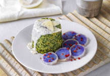Tortini al vapore di spinaci e formaggio con patate viola e fonduta leggera