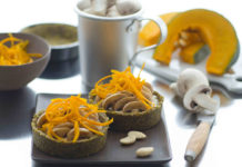 Tartine ai pistacchi con ricotta di mandorle e funghi marinati