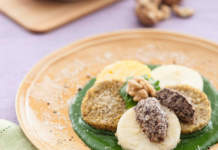 Gnocchi di tre polente con paté di radicchio e salsa di spinaci