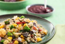 Riso misto all’orientale con dadolata di verdure e salsa di barbabietole