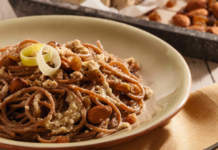 Spaghetti di farro al ragù di tofu, porri e uvetta