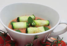 Crema fredda di pomodori e sedano con involtini di zucchine