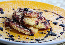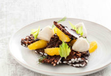 Cialde di cioccolato e riso con crema di mandorle e arance profumate