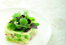 Tortino crudo di avocado, mela verde e ravanelli con maionese di mandorle