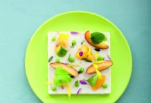 Bavarese di cocco alla vaniglia con insalata di susine e piselli