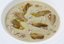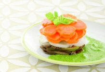 Tortino a strati di carciofi, carote e daikon con crema alla rucola