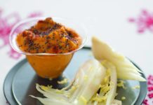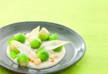 Purè di sedano rapa con cavoletti di Bruxelles, indivia e lupini