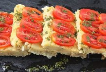 Piccoli quadrati di farinata agli asparagi con pomodori