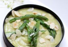 Vellutata di asparagi e cipollotti con maggiorana e scaglie di mandorle