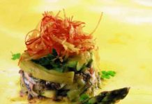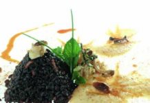 Delizie di riso venere, scampi, alghe nori, funghi in salsa di capesante e zenzero