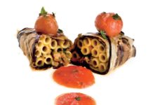 Rollata di melanzana con ziti al ragù di soia e verdure