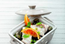Filetti di ricciola marinati con stufato di fave e piselli alla menta