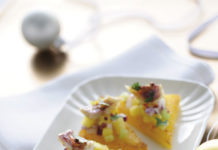 Triangoli con ratatouille cruda al mango con triglie e coriandolo