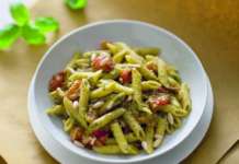Penne al pesto di nocciole con pomodori e pinoli