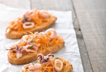 Crostoni di pane con carote e calamaretti