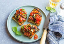 Bruschette con melanzane e pomodori al pesto di capperi e mandorle