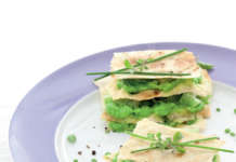 Piccole torri croccanti di pane carasau e crema di piselli