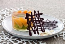 Aspic di clementine e kiwi alla vaniglia con griglie di cioccolato fondente