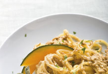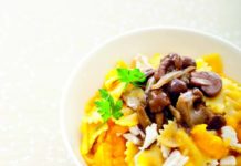Farfalle in salsa di zucca e funghi con filetti di pesce
