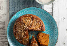 Torta morbida di farro, zucca, pere e nocciole con salsa alla vaniglia