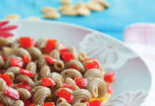 Riccioli integrali con peperoni al timo e crema di zucca