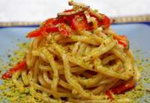 Spaghetti alla chitarra con pistacchi, pomodorini e tofu affumicato