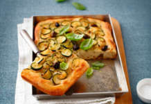 Focaccia ai semi di lino con zucchine e olive taggiasche