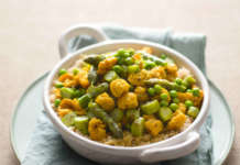Cuscus integrale con spezzatino di soia, piselli e asparagi