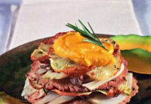 Millefoglie di castagne con finocchi, patate gratinate e salsa di zucca allo zenzero