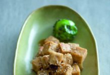 Tofu croccante al malto con sesamo, zenzero e cavoletti