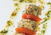 Piccoli quadrati di farinata agli asparagi con pomodori