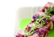 Spiedino di tofu al vino rosso su vellutate di piselli e patate