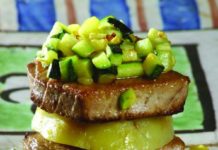 Medaglioni di pesce spada con ratatouille di zucchine e gamberi