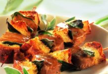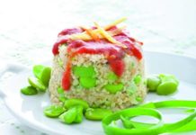 Tortino di bulgur, fave e ricciola, in salsa di pomodoro allo zenzero