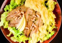 Petti di pollo in insalata con riccia, spinaci e olive