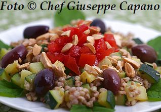 - Mescolare il grano saraceno con le zucchine e disporre il tutto nei piatti, nel mezzo mettere i pomodori e intorno le olive, cospargere con le mandorle tritate grossolanamente e decorare con altre foglie di menta fresca.